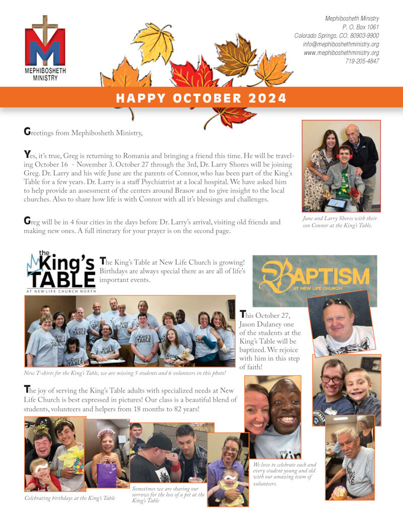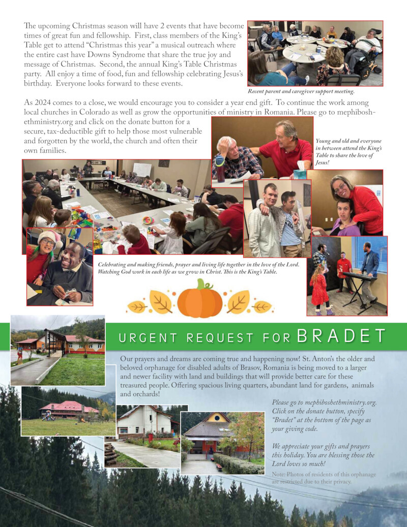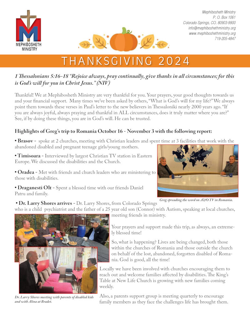 In 1992, Mary Jane Ponten, a retired widow with cerebral palsy, and John Nix, a father of twin daughters with cerebral palsy, founded Mephibosheth Ministry to communicate to the churches, community groups and others the importance of reaching out to families affected by disabilities, to build a community of love, care and compassion.